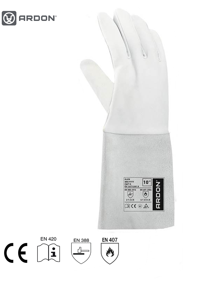 ARDON GLEN rukavice su sive rukavice za varenje od pune kože. Zadovoljavaju opće uvjete za zaštitne rukavice, kao i uvjete norme za zaštitne rukavice od mehaničkih i toplinskih utjecaja i norme za zaštitne rukavice za zavarivače. Otporne su na habanje, posjekotine, trganje i kontaktne temperature do 100 C